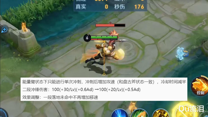 斧子形态的一技能基本没啥变化,第一段朝指定地点跳跃,第二段落地后冲向目标,不过现在的一技能第一段落地未命中目标不再增加移速;拳头形态的一技能改为向前冲刺一小段距离,不再是跳跃后落地,冲刺后增加攻速,冷却时间减半。