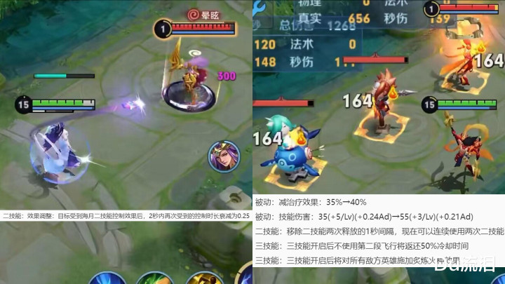 最后在体验服中海月和哪吒也进行了调整:现在目标在受到海月二技能控制后的2秒内,再次受到二技能的控制时长衰减为0.25秒。哪吒被动的减治疗效果提升5%,被动的技能伤害前期增强后期削弱;二技能现在可以连续释放;三技能开启后会给敌方所有英雄施加被动效果,并且如果不使用二段飞行还会返还50%的CD。