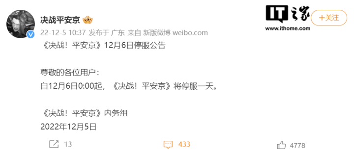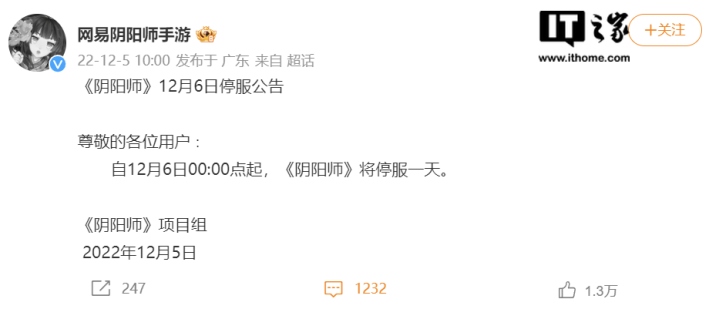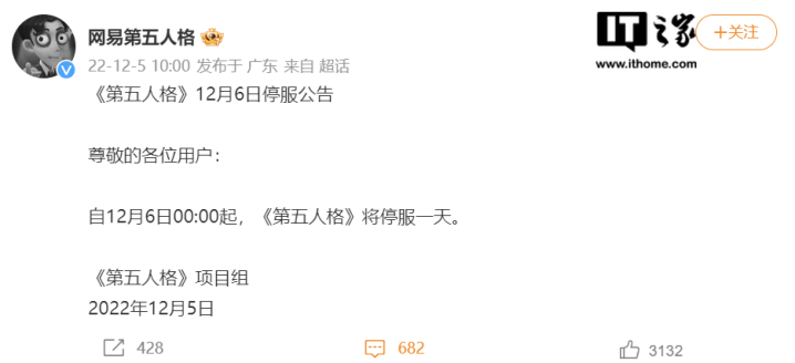 IT之家12月5日消息,在腾讯旗下《地下城与勇士》《英雄联盟》《英雄联盟手游》《王者荣耀》等多款游戏宣布12月6日停机停服后,网易旗下《第五人格》《阴阳师》等多款游戏今日上午也发布了12月6日停服公告。