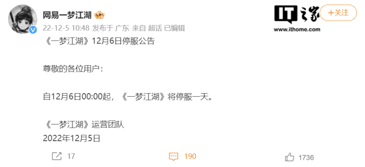 据IT之家不完全统计,自12月6日00:00点起,网易旗下《第五人格》《阴阳师》《一梦江湖》《决战!平安京》等多款游戏将停服一天。