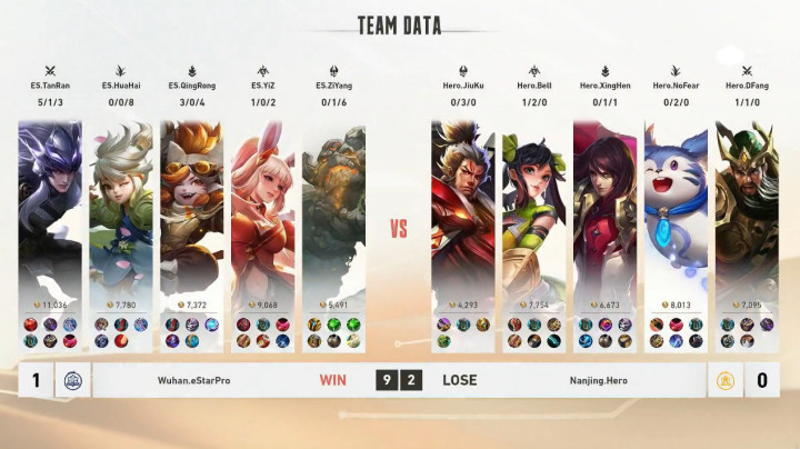 比赛采取的是BO2赛制,第一局,eStarPro坦然马超迅速支援,击杀张飞拿到一血;一分五十秒上路,Hero东方关羽单杀马超。六分半中路,eStar子阳开到三人,武汉eStar集火击杀孙尚香,顺势控下暴君,逐渐打出优势。十二分半,武汉eStar带主宰先锋冲破上高,随后直接抱团压入水晶,击杀三人后强点水晶拿下胜利!