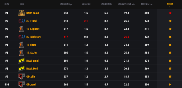 来看一下目前的选手淘汰榜Top10,原本领跑的小鬼在第二天成了倒霉蛋,开局一上来就白给后很难找回手感,被DNW的Seoul和EU的Fludd反超,其实3人的淘汰数都是20个,只是对方伤害量高一些,要说Seoul也真是不容易,DNW昨晚决赛圈4打3被CES翻盘,战队整体表现这么拉的情况下他还能猛拿分,真是拖着队伍在走。第2到第8名上榜的选手都是来自17,NAVI和EU的队伍,最后两位是目前处于积分榜第七名OP战队的clib和vard。