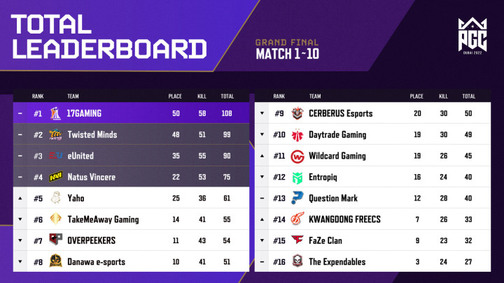 绝地求生2022PGC决赛的赛程已经过半,目前积分榜上只有一支总分破百的队伍,那就是咱们PCL赛区的17战队,不过这次身后队伍的分差变小了一些,EU和TM拿到了单日积分前二,同样手握90多分,NAVI跌到了第四名。还记得首日比赛过后小梦就提到TMA打架不虚,但要提高自己的决赛圈率,随后第二轮的比赛中他们就两次进入决赛圈,还险些把TM斩落马下,肉眼可见的进步让TMA首次进入了前六名的行列当中,两支PCL队伍真是带给了我们很多惊喜。