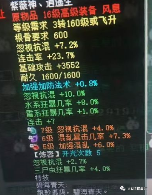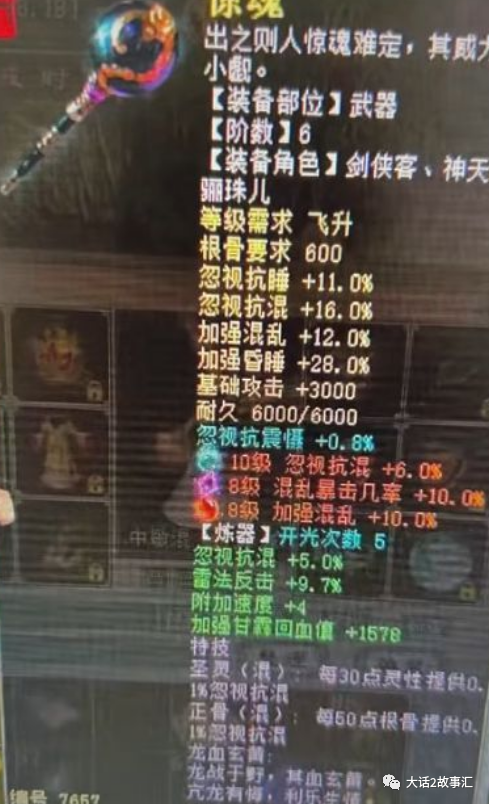 最后我们看看极品混6阶的天花板吧。底子是忽视抗混16,加强混乱加12,炼器效果是忽视抗混加5,附加速度加4,特技是圣灵混和正骨混,不算宝石这样的底子忽视混已经非常恐怖极限了吧。第一次觉得这个10级宝石有点配不上这把武器。
