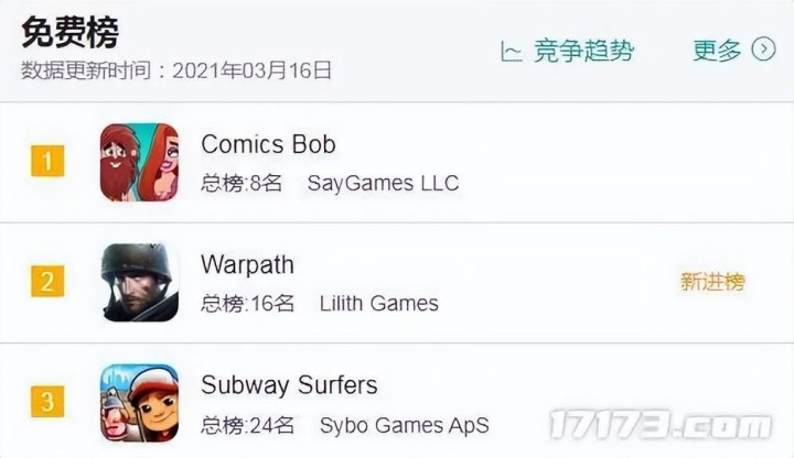 《战火勋章》iOS端上线第一天便进入了俄罗斯的确iOS免费榜前三,首日排名第二,目前依然排名第三,而根据Sensor Tower游戏主页介绍,该游戏的安卓版本在俄罗斯地区最受欢迎。