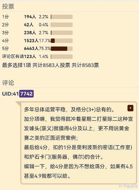 总计8583人投票,九成以上的网友愿意给网易打出4-5分的评价。这在向来纷乱的NGA论坛投票,已经是相当难得的投票结果了。