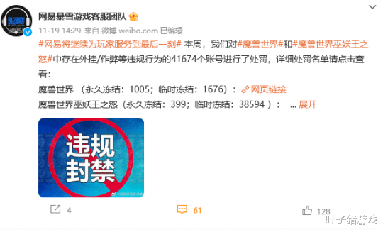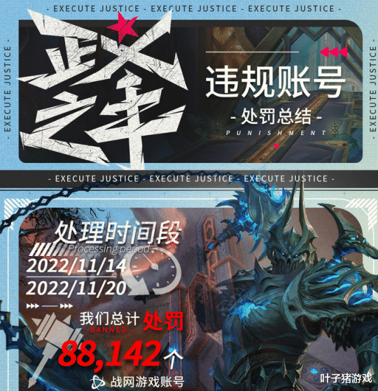 在2022年11月14日至2022年11月20日期间,网易暴雪游戏客服团队共计处罚了88,142个战网游戏账号,其中就包含《魔兽世界》、《守望先锋:归来》、《魔兽世界:怀旧服》、《炉石传说》、《风暴英雄》、《星际争霸》等曾红极一时的游戏作品。