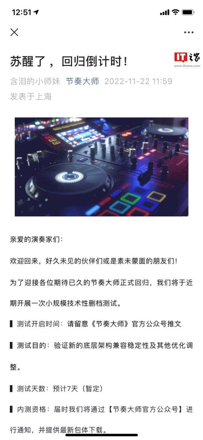 IT之家11月22日消息,据节奏大师官方,为了迎接各位期待已久的节奏大师正式回归,我们将于近期开展一次小规模技术性删档测试。