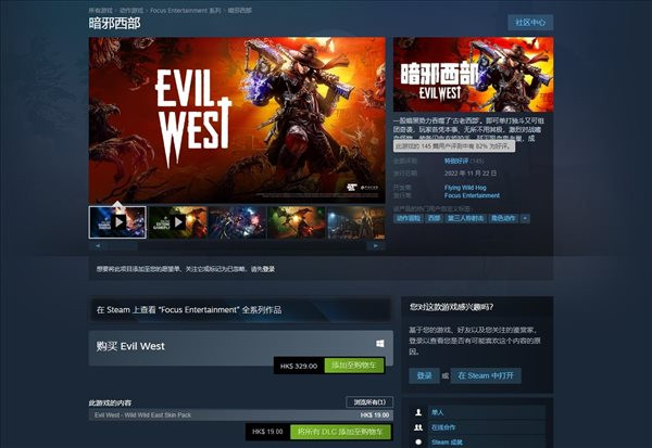 由FlyingWildHog制作的动作射击游戏《暗邪西部(EVILWEST)》今日(11月22日)正式发售,截止发稿时游戏总体评价“特别好评(82%好评率)”,不少玩家表示西部屠杀吸血鬼十分爽快,不过玩久了有点晕。