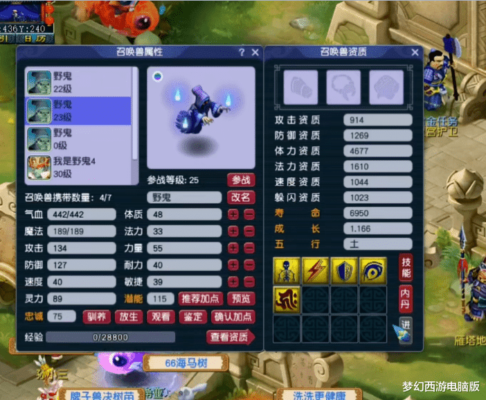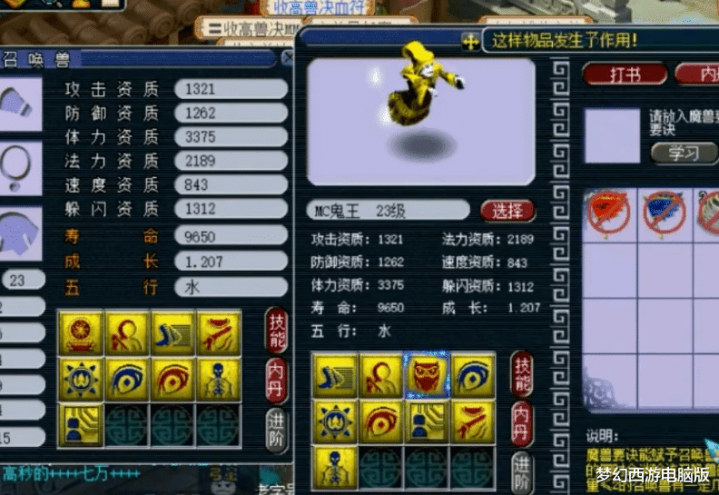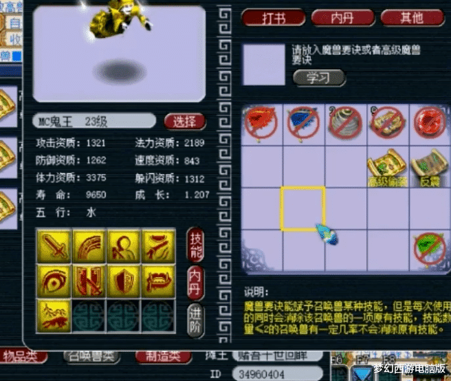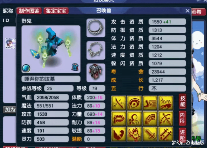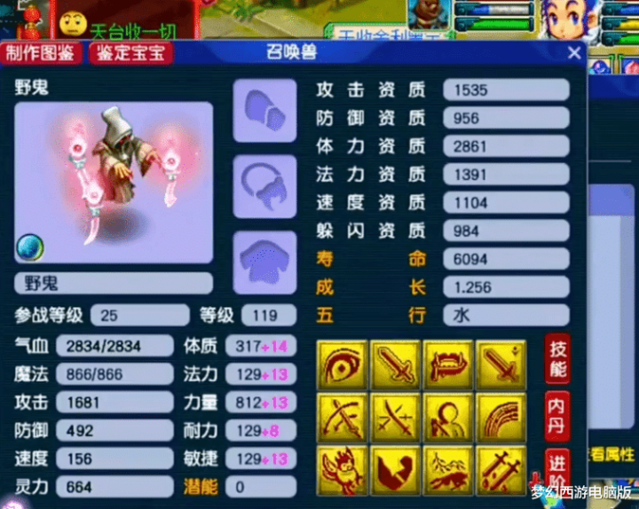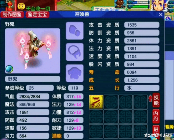 第5只,13技能翻页野鬼。这只野鬼一共有两个亮点:第1,就是技能格子够多。第2,就是它的成长!这已经远超同等级的其他召唤兽了,毕竟在在资质相同、加点相同的情况下,高成长者的各方面属性肯定要优于低成长者。接下来,再给大家展示几只拥有特殊技能的野鬼!