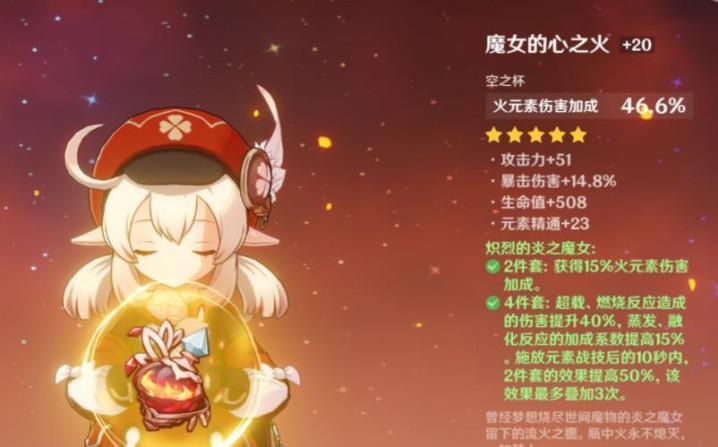 圣遗物搭配:魔女四件套、追忆四件套。阵容:可莉、行秋、钟离、班尼特。
