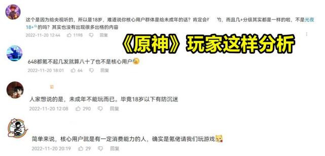 可刘伟的分析与网友们的判断并不相同呀?如果《原神》的核心用户群体真的是18岁以上,那之前为何又要更改琴、莫娜4位角色的建模?有网友分析: