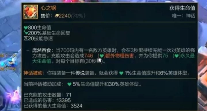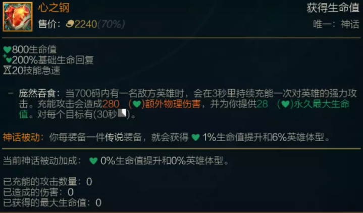 这件装备有点小厉害,因为它有着无限成长的属性。心之钢会提升携带者的生命值,而触发的效果也很简单,那就是在距离别人700码的范围待上三秒钟,然后就可以平A一下即可,有点类似于不灭之握的特效,但是所给予的视觉冲击力,可要比不灭之握强很多了。