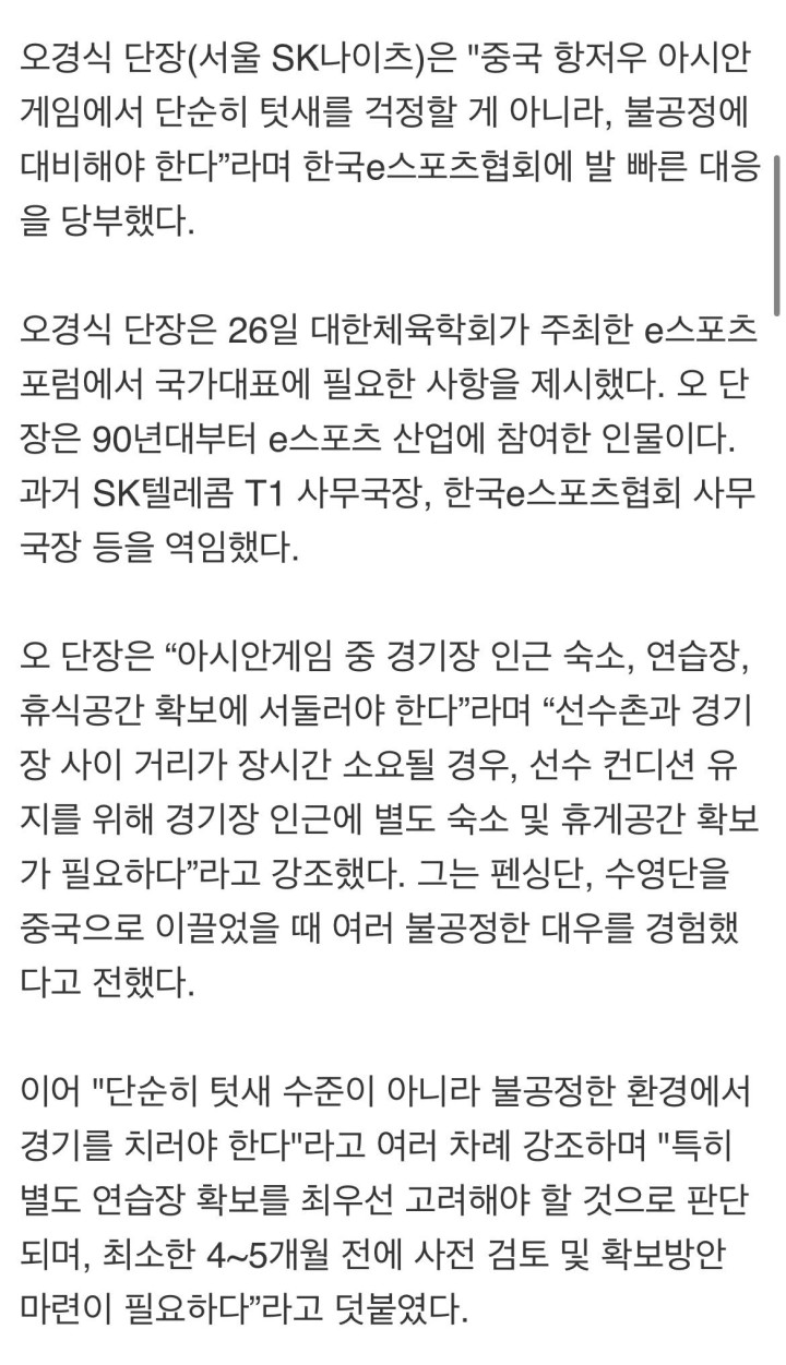 韩国电子竞技协会局长表示,在带领击剑队、游泳队到中国比赛时,经历了很多不公平的待遇。他多次强调:这不是单纯的外出比赛,应该做好在不公平环境中比赛的准备。”