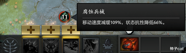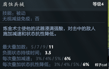 其次,他的新技能:腐蚀兵械,可以给敌人施加可以叠加的减速和减抗功能,减速其实都能想到有哪些英雄,尸王的墓碑,小狗的尸鬼狂怒,剧毒的毒刺等等。但是能够减抗性的技能,这就很厉害了。先不谈英雄的抗性,目前能加抗性的物品就是散华以及散华合成的双刀和天堂,而这两件道具不是每个英雄都能用的上的。其次叠加属性,炼金升满被动技能,叠满最大11层,将会造成对面英雄移速减缓109%,抗性降低66%。