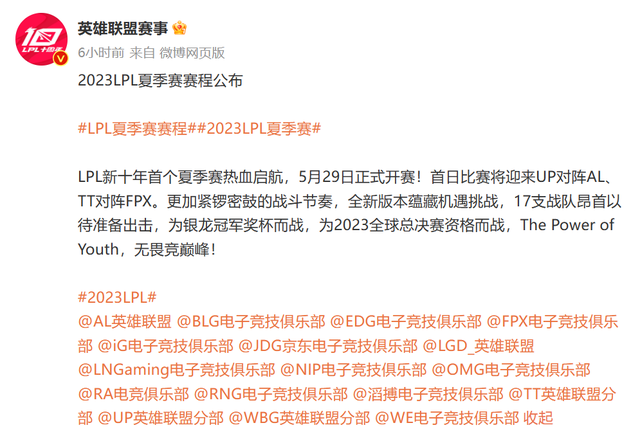 众所周知,在今年对于电竞圈来说最重要的赛事莫过于将在下半年举办的杭州亚运会,由于这次《英雄联盟》作为正式竞赛项目的关系,收获的关注度自然远超以往,比赛的含金量也比上一届更高。而因为亚运会国家队选拔以及后续比赛的关系,为了避免造成冲突,今年LOL联赛以及国际赛事的时间安排得都十分紧凑,甚至夏季赛开始的时间也有所提前。在今日LPL官方公布了夏季赛的开赛时间与详细赛程,引起了网友的热议。
