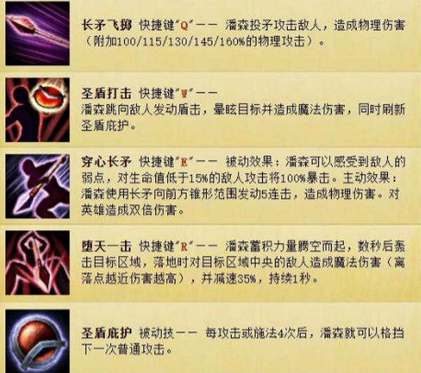 大家可能都听说过一句话:“如果不改潘森,ADC就不会上单。”这句话一点都不夸张。首先来看一下潘森的旧版技能,其被动效果为:4次攻击或者施展四次技能后,将会形成一面护盾,能够防御普通攻击,强化普通攻击,甚至能够防御大头炮台的攻击。他的Q技能是个方向性的投掷,就像一个标枪。W技能是一个有定向性的技能,并带有一定的被动效果。E技能可以对目标进行范围攻击,对目标的生命值造成致命一击。而他的大招是一个远程辅助技能,可以攻击一定范围内的目标并减速其行动。