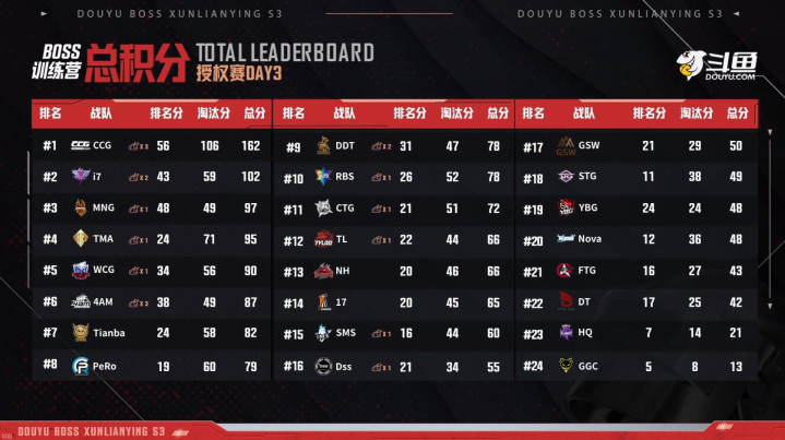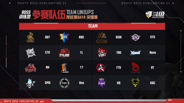最后几场小组赛和咱们的赛前预测出入不大,让小梦比较意外的是DDT居然没能晋级止步第9,不过他们仍然有在败者组争取名额的机会。先是前八名的CCG,i7,MNG,TMA,WCG,4AM,Tianba和PeRo拿到了直进BOSS杯授权赛决赛的名额,后面的16支队伍,DDT,RBS,GSW,STG,CTG,Tyloo,YBG,Nova,NH,17,FTG,DT,SMS,Dss,HQ和GGC要进行一轮突围赛争夺剩余的8个决赛名额,感觉这周的比赛要比前几周更难预测,不知道大家更看好哪几支队伍?