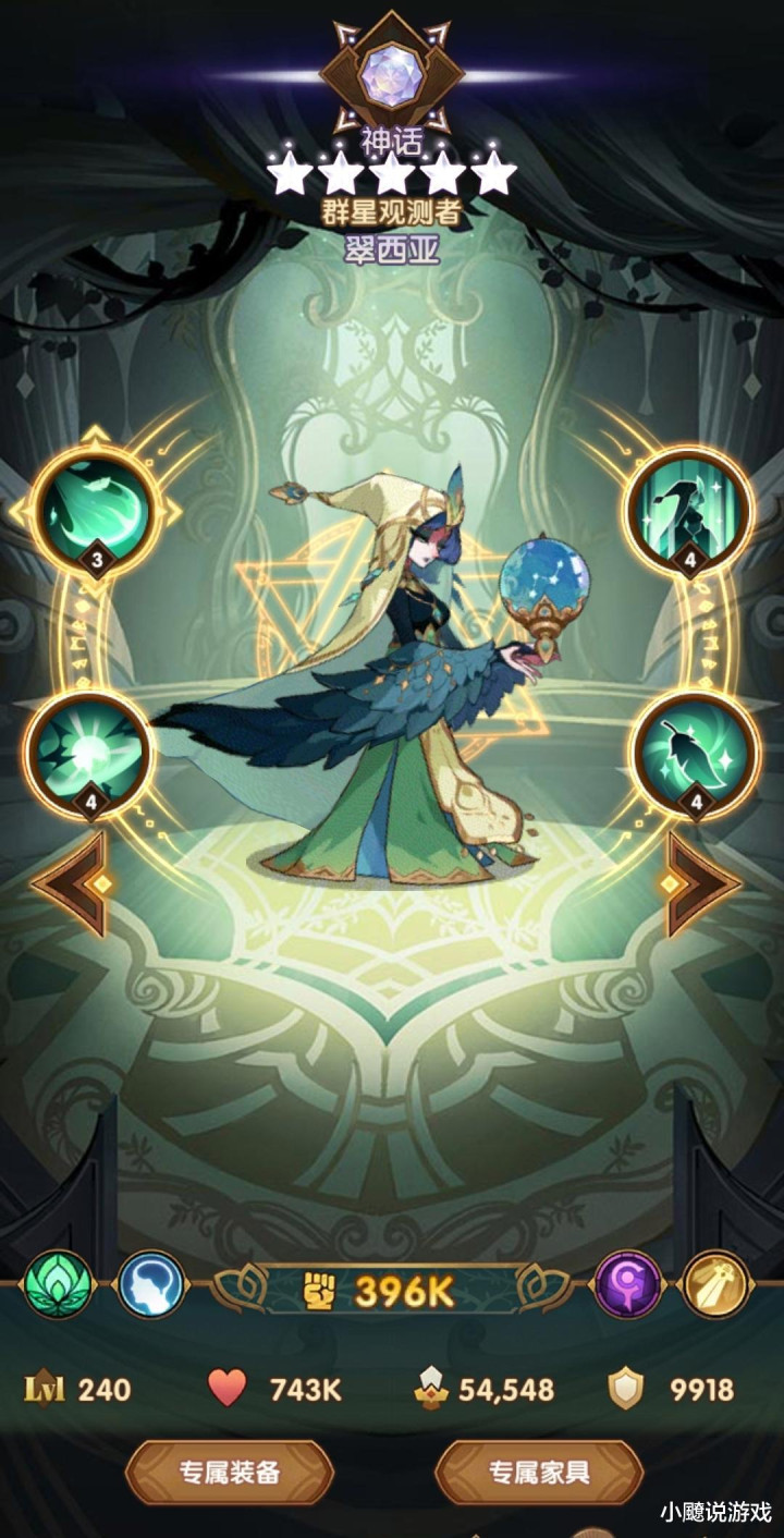 三技能“命运观测”也是被动技,就是解释两种普攻方式的切换形式,当对面敌人满人时,普攻星明模式是100%概率,如果这样计算的话那少1名敌人的话,星明模式概率是80%,星蚀模式就20%。同理,只剩下1名敌人,星蚀模式概率就100%了。由此看来小翠的普攻方式变成偶然性了,有时群攻,有时单体。此技能的升级还会使受到这两种攻击模式的敌人防御降低,且30刻印后还获得持续1.5的掉血状态。