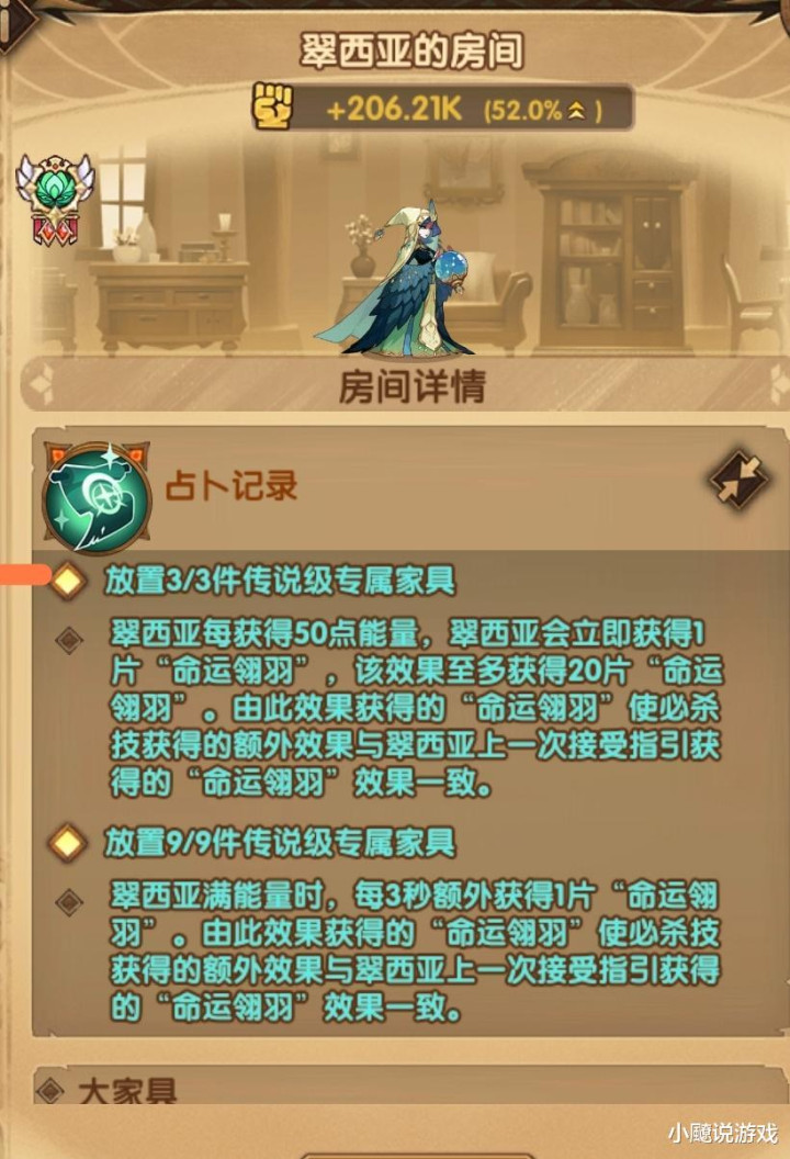 专属家具技能”占卜记录“,3件效果,让小翠获得翎羽更快速,就是每有50点能量来一片,不过此效果获得的翎羽最多20片。9件效果,当能量格满后,每3秒获得1片翎羽,没有数量限制。这个家具必须满上,没得说。