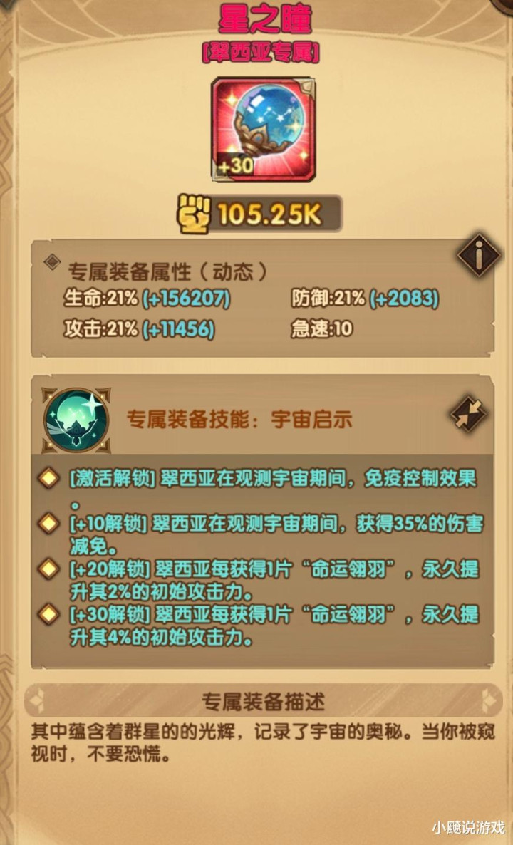 专属装备技能”宇宙启示“,观察宇宙期间免疫控制效果,有35%的伤害减免,且每片翎羽还能永久提升攻击力。观察宇宙期间?难道是必杀技使用中吗?不解。