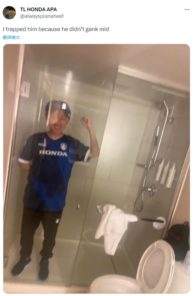 直播吧8月18日讯LCS季后赛正在进行,TL战队中APA更新动态,称由于Pyosik在游戏中不到中路Gank,自己线下把Pyosik直接锁在卫生间,并配上照片。此前FLY战队打野Spica曾因为不去下路Gank,被队内下路选手Prince直接关进狗笼。