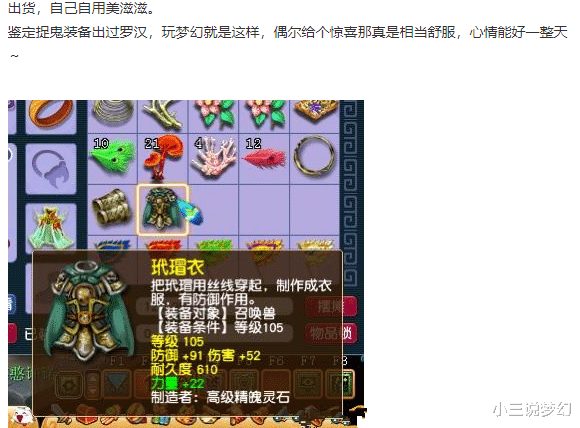 在梦幻西游中有一部分玩家在游戏里获得了东西以后不会着急出售,他们会将很多东西攒起来,某些可以打造或者几率玩法的东西会自己使用,上面这位玩家现在就自己打造出来了一件105级的召唤兽装备,这件召唤兽装备增加了52点伤害和22点力量,综合伤害属性达到了74,而且这位玩家在以前的抓鬼任务中还获得过拥有着罗汉金钟特技的装备,这就是单开玩家的小确幸,运气好的时候可以以比较低的成本获得梦幻西游中那些特别值钱的道具奖励。