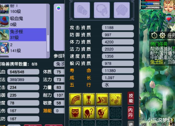 谁能够想到在商会中能够买到高价值的召唤兽,上面这位玩家做师门是买到了一只符合任务要求的兔子怪,结果师傅却不要,因为这只兔子怪天生就拥有着7个技能,而且其中的三个还是红书技能,这6个红书技能就让上面的只持召唤兽变成了高价值召唤兽,完成交易以后是需要符合系统的高价值召唤兽交易规则的,也就是上面这位玩家需要等三天的时间才能够交易给其他人,现在的这只召唤兽是没办法用来完成师门任务的。