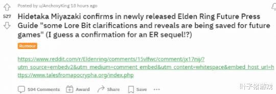 就是因为这句话,“环学家”们分析《艾尔登法环》未来将会有续作或者不止一个DLC。在这个帖子下,许多网友都表达了自己对新内容的期待。但需要注意的是,这些内容全都来源于个人揣测,不论是宫崎英高还是FromSoftware,其实都没有进行过这方面的表态。