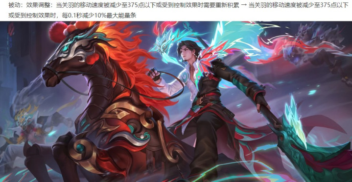 关羽加强:受到减速或强控不会直接断腿和清空能量条,而是1秒内逐渐减少能量值。