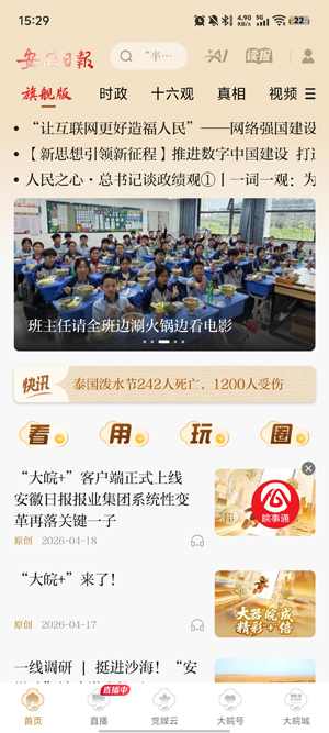 个性化界面切换:用户点击首屏左上角的“媒体群”,即可在旗舰版、安徽日报版等不同视觉风格与内容侧重的界面间自由切换。