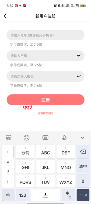 在注册界面填写你的账号和密码,点击完成注册。